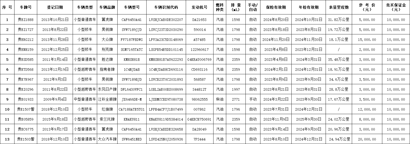 4、本次拍卖标的不含车牌号,里程数为表显公里数,仅供参考,以实际为准;若车辆有年检、保险过期或检测不合格的,由买受人按相关规定维修过户,维修、脱保、脱检等费用由买受人完全承担,竞买人请务必实地看样并咨询,拍后无悔。