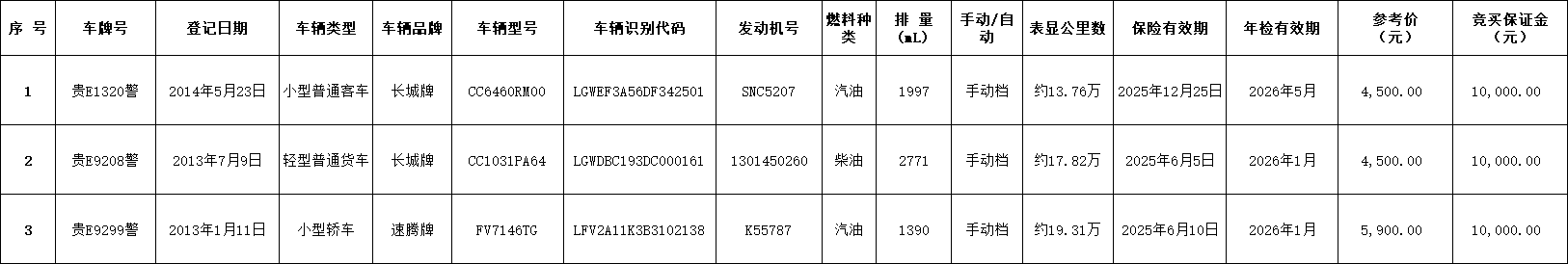 受委托,黔西南州天鼎拍卖有限公司于2025年10月23日上午9:00至10:00(延时除外),在中拍平台天鼎拍卖主页(https://paimai.caa123.org.cn/)对3辆警务用车进行公开拍卖。