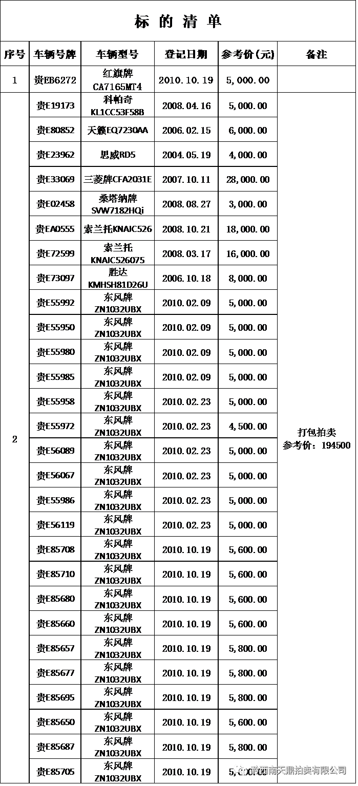 我公司受委托,定于2020年5月28日上午10:00时,在兴义市兴义大道大商汇1号楼1104室,对以下车辆进行公开拍卖(2号标的为打包拍卖)。
