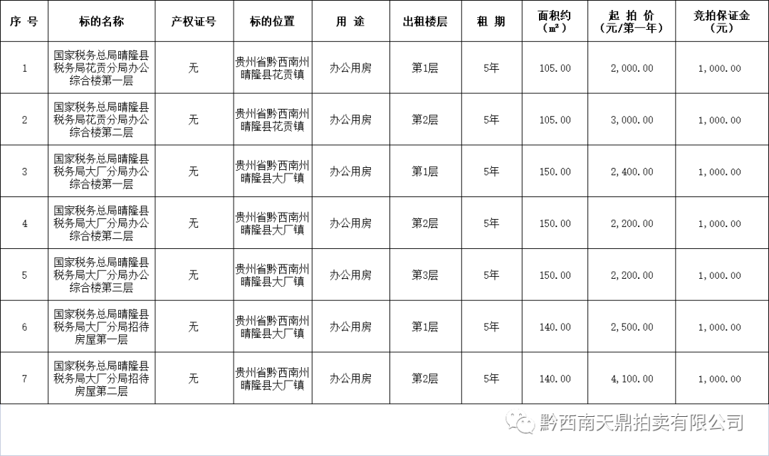 黔西南州天鼎拍卖有限公司将于2023年5月26日下午15时起至16时止(延时除外)在全国公共资源交易平台(贵州省黔西南州),对国家税务总局晴隆县税务局办公用房进行公开拍租。